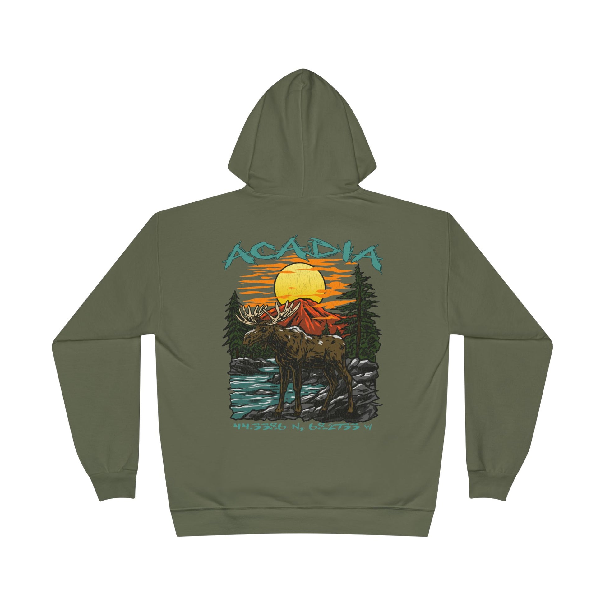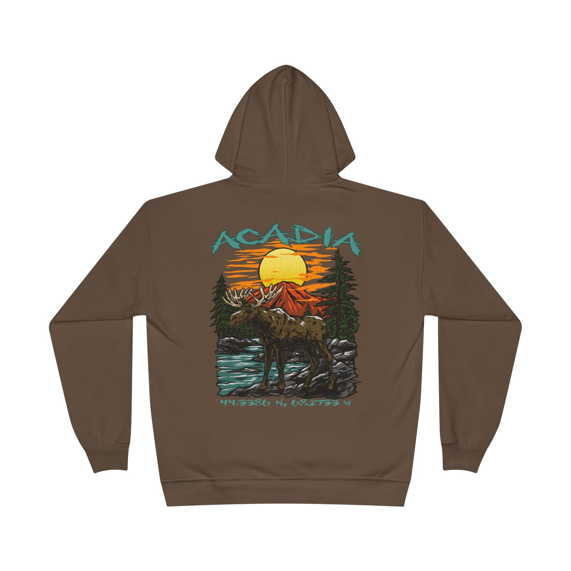 Adventure meets comfort in this Wild Peak hoodie. Featuring a bold back graphic of Acadia’s moose, pine forests, and sunset, plus the exact coordinates of the park, this hoodie connects you to the wilderness wherever you roam. The front stays clean with a kangaroo pocket for essentials, making it both practical and stylish.